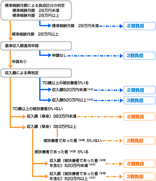高齢受給者の負担割合は、被保険者の年齢、標準報酬月額および収入によって決まります。