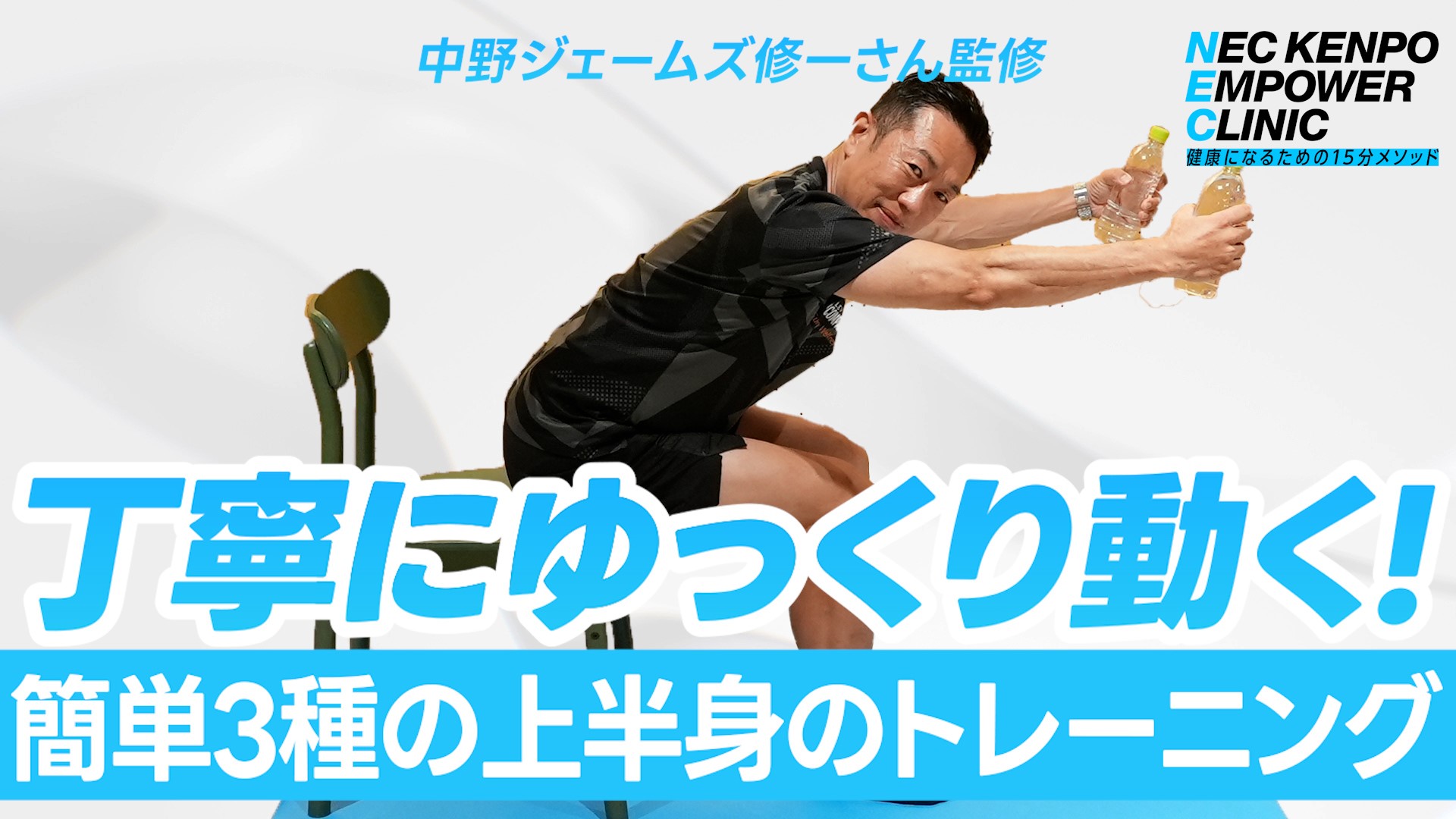 4月 中野ジェームズ修一先生がご考案 NECけんぽオリジナルの体操 日々の運動不足を解消する、ルーティン化しやすいトレーニング 座り仕事が多い方に取り入れていただきたいトレーニングです。 |